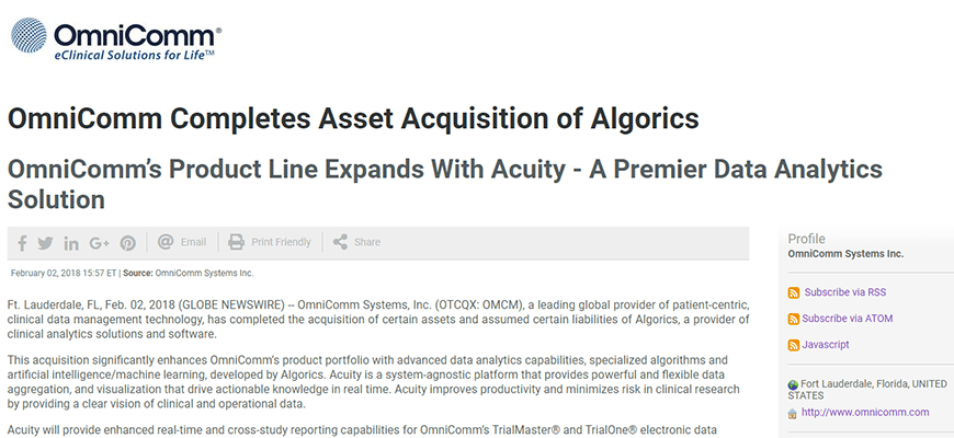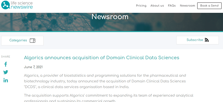 DIA Capital Advisors acted as an exclusive financial advisor to Algorics in acquisition of Domain Clinical Data Sciences