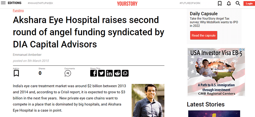 DIA Capital Advisors advised Akshara Eye Hospital in their second round of angel funding