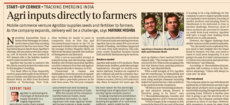 Nishant Navin, Founder and Managing Partner of DIA Capital Advisors, was quoted in Business Standard's START-UP CORNER providing an Expert Take on mobile commerce venture AgroStar
