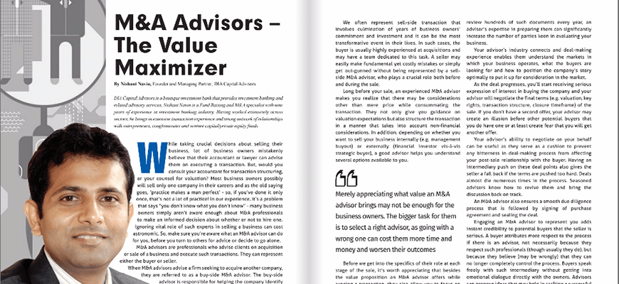 Nishant Navin, Founder and Managing Partner of DIA Capital Advisors, authored an article (titled ‘M&A Advisors – The Value Maximizer’) for Consultants Review magazine